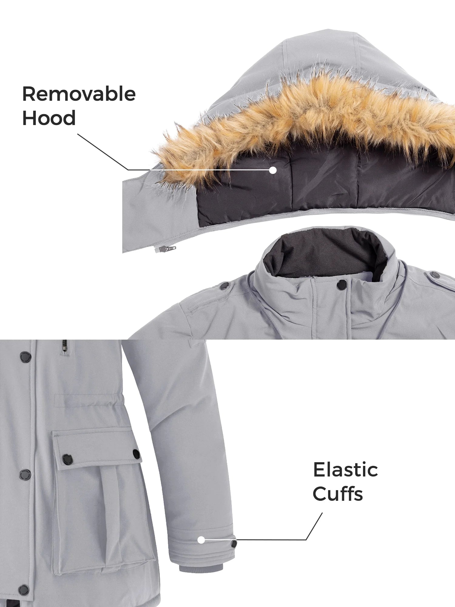 • Windproof Hood: Features a faux fur-lined hood with wide earflaps for protection against the cold
